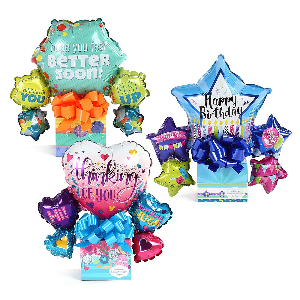 Cascading Balloon Gift Assortment comes with a colorful cardboard box, 3.9 ounces of fruity hard wrapped candy and a 10" air filled balloon. Balloon and container designs are assorted and may vary from what is shown. ProgressiveBalloons.com is your 24 hour online wholesale balloon, wholesale plush, and wholesale gift store! Make Progressive Balloons & Gifts your final destination in your wholesale shopping!