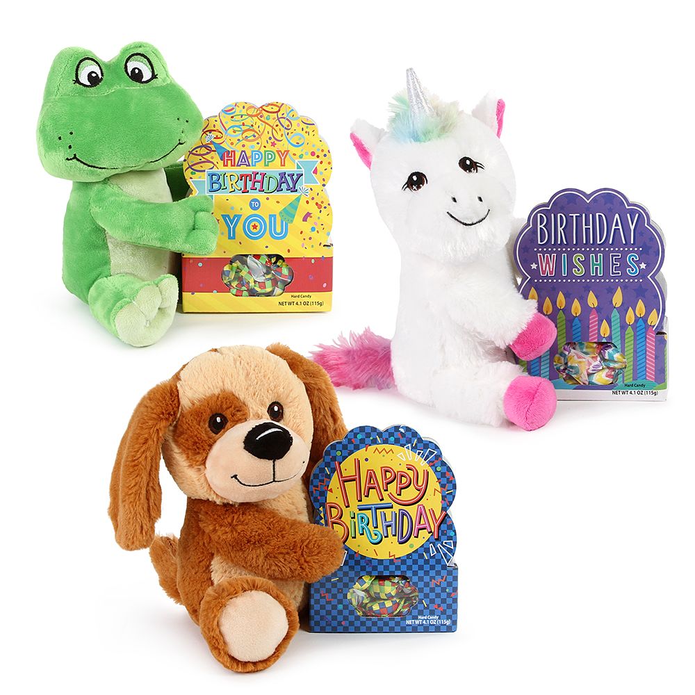 Our Birthday Cutie Plush Gift Assortment container includes a small plush animal holding a decorative candy box with 4.1 oz of hard wrapped fruity flavored candy. ProgressiveBalloons.com is your 24-hour online wholesale balloon, wholesale plush, and wholesale gift store! Make Progressive Balloons & Gifts your final destination in your wholesale shopping.